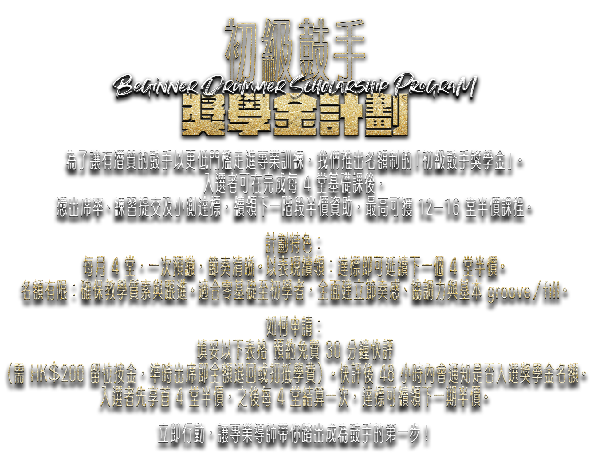 立即申請 30 分鐘免費初級鼓手獎學金快評,親身體驗 DrumLab® 的專業教學,開啟屬於你的音樂旅程!